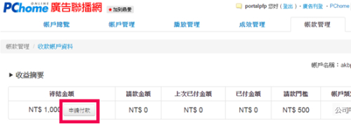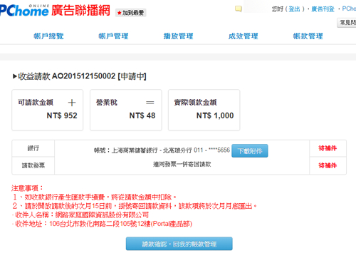 每月1日:結算當月(上個月1日至上月底)廣告收益分潤。 當月5日至當月10日:可申請付款。廣告收益需達到最低請領金額NT$500,且設定完收款銀行帳戶。