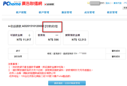 2. 當月5日至當月15日前需寄到:請掛號寄回以下檢附文件 ●收款帳戶-匯款單 ●收款銀行帳戶存摺封面影本 ●請款發票(會計科目請開:廣告費用)