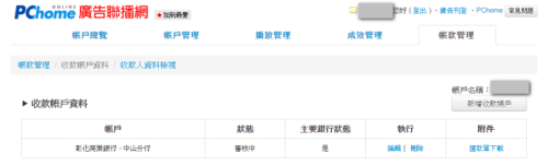 新增完畢後,請下載匯款單填妥後,連同銀行存摺帳號封面影本一併寄回。收款帳戶資料經審核無誤後,狀態會更新為審核成功。