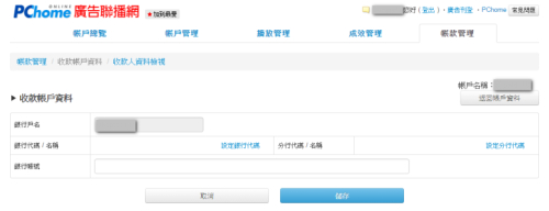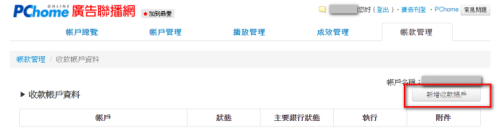 帳款管理 >> 收款帳戶資料 > 新增收款帳戶 帳戶戶名需為申請廣告聯播網帳戶時所填寫的資料。