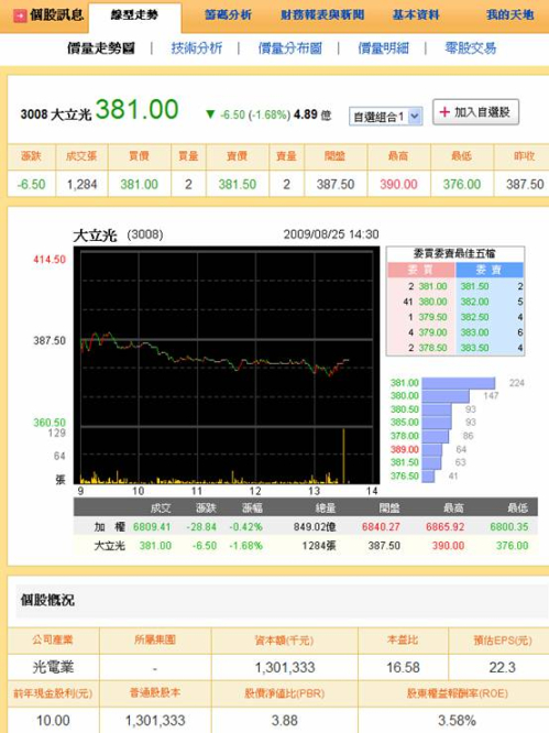 個股訊息 - 價量走勢頁面中資訊豐富,在此頁裡有清楚的個股報價資訊、盤中股價走勢圖,此外也可直接看到個股的基本概況。