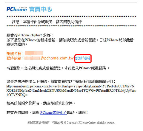 步驟四: 進入您的聯絡信箱,您會收到一封「PChome會員認證信箱通知信」,請按下「認證信箱」連結完成認證就可以了。