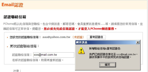 步驟三: 按下「重寄認證信」後系統就會再重新寄一份認證信到您的聯絡信箱。